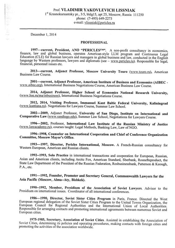 | Преподаваемые учебные предметы, курсы, дисциплины (модули) | Преподаватель юридических дисциплин. Vladimir Lissniak, president of Pericles, (http://www.pericles.ru), has extensive experience in public, private and NGO sectors, diplomatic service, law practice, and academic activity. He has worked as a consultant in the Moscow Mayor’s Office, for the Administration the RF President. He has been practicing law privately for the last 30 years for Russian and foreign clients in courts of general and special jurisdiction in a number of countries and Strasbourg court of human rights. Mr. Lissniak has taught American Business Law, Banking Law, Negotiations and other courses in the Institute of International Law of the Russian Ministry of Justice, MGIMO, Higher School of Economics, University of San Diego (California), the American Institute of Business and Economics (AIBEC), Immanuel Kant Baltic State University, and PERICLES Training and Consulting Center. He was chief editor of the Russian edition of “The Banking Law” by prof. Gavalda and prof. Stoufflet (France). Occasionally he conducts training workshops on negotiations for Russian and foreign corporate clients (White and Case, Baker and McKenzie, Moscow Times, Gazprom Neft, New York Film Academy, OAO “Vympelcom” (“Beeline”), a few banks, industrial enterprises etc.)and consults in deal-making and deal-breaking in business and some other spheres. He can be reached at: vlissniak@pericles.ru |
